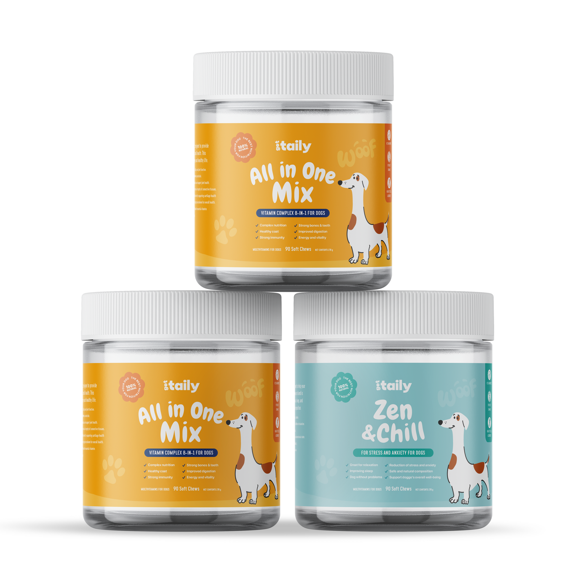 "All in One" je kompletný vitamínový doplnok pre psov, ktorý obsahuje 10 esenciálnych vitamínov a minerálov. Tento komplex podporuje celkové zdravie a pohodu psa, vrátane silných kostí, zdravých kĺbov, lesklej srsti, silnej imunity a lepšej trávenia. Pomáha tiež zvýšiť energiu a vitalitu vášho psa.